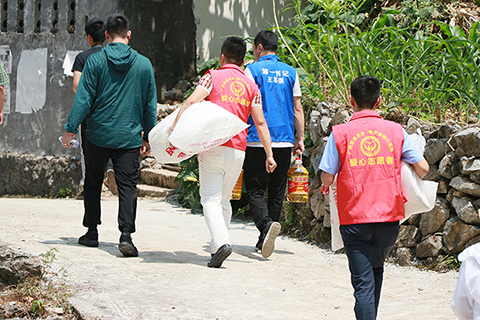 马山县古寨瑶族乡龙林村位于南宁北面的一个偏僻农村,贫困户家庭住址交通不便,道路崎岖,身着红衫的南宁脑博仕中西医结合医院有限公司爱心志愿者们走在乡间的小路上,显得特别的精神。